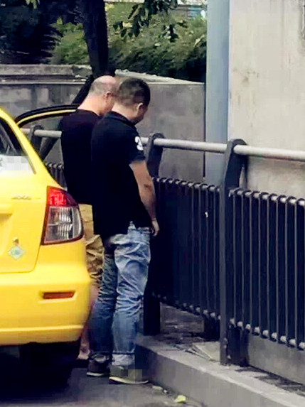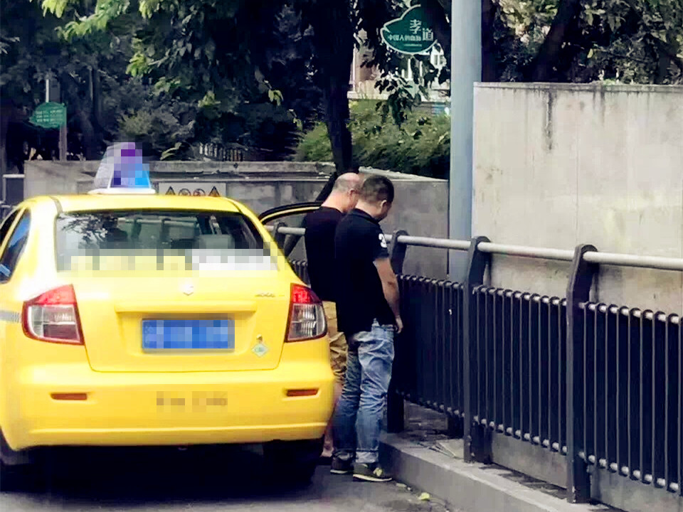 从抓拍到的画面中我们可以看到,两名男子都背向着出租车,面向人行道,肩并肩站在了一起,似乎在交流着什么。