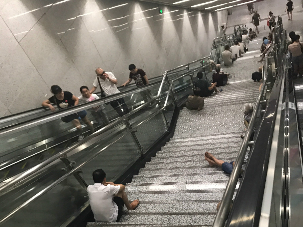 热化了!阿姨叔叔轻轨通道里避暑