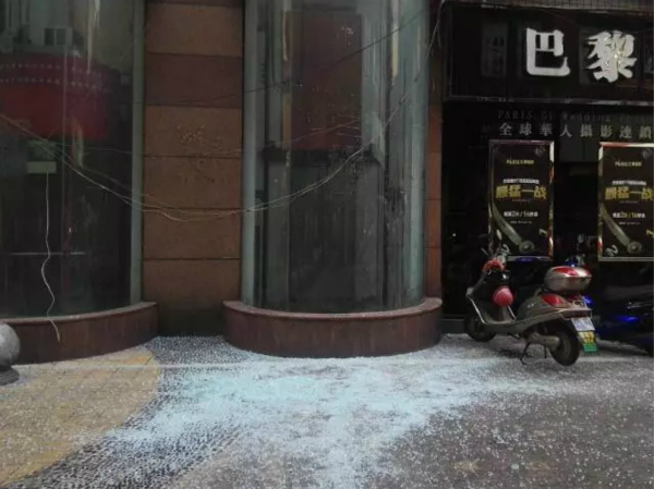 抬头一看,才发现是三楼观光电梯的外围玻璃炸裂了。而此时炸裂的玻璃,还有一部分仍在观光电梯外围的玻璃框上,时不时地往下掉。