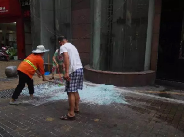 目击者曹女士介绍说当时只听见“哐”的一声,在一位妇女前面一米左右的位置,玻璃碎了一地。