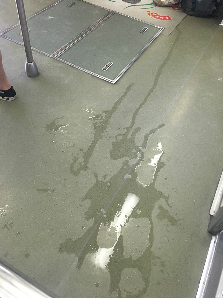但是这名大妈没有这么做,还是帮孩子脱了裤子让她蹲起窝尿,尿流过这个车厢。