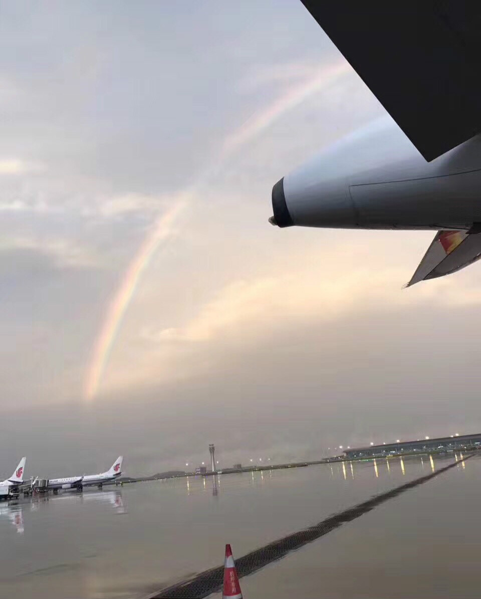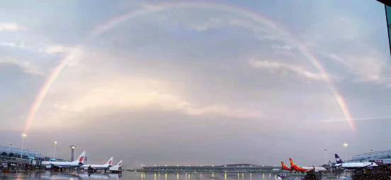 在江北机场上空出现彩虹,呈半圆形的彩虹横跨机场停机坪。