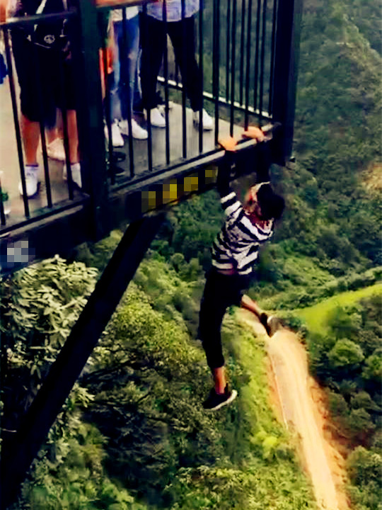 目测一个二十出头的小伙,在悬空千米的天悬廊桥外围处炫技。他时而做仰卧起坐,时而做引体向上,时而做俯卧撑。