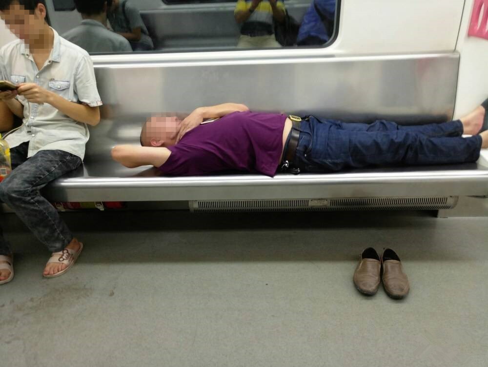这位大叔以手臂为枕,双脚都快提出座位了,另一只手指抚摸着下巴,露出腰上白花花的肥肉,似乎在说:“我帅吗?”,睡姿看着十分安详。