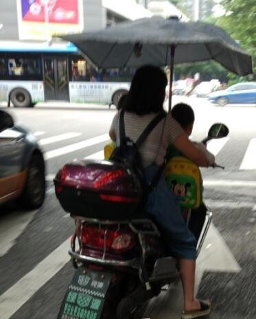 心真大!女司机抱着两小孩骑电动车 雨中狂奔