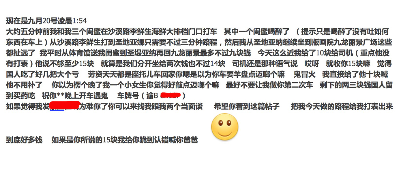 发布时间:2017-09-20 11:34:43今日凌晨一点五十四分,一位重庆綦江区的小姐姐在网上发了个帖子,主要是气不过一出租车司机多要的五元钱。于是在给司机发了战帖,还要邀司机出来当面对峙,若按着打表来,真能多出五块钱,则要跪着叫司机爸爸!