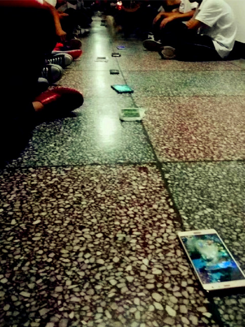 通过照片可以看到,同学们分别坐在一走廊的两端,手机则放在中间,已经都统一打开了王者荣耀。