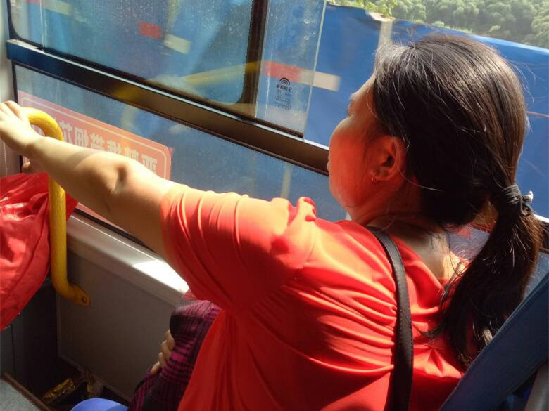后来到雷神店站的时候,上来一位三十岁左右,穿着橙色T恤的年轻女子,当时没有座位了,她就站着。没过几分钟,她就大声嚷嚷说晕车,难受之类的话。