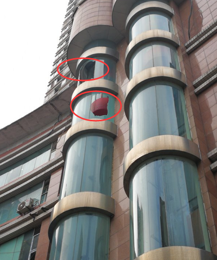 原来是人寿大厦外的公共电梯玻璃炸裂了。