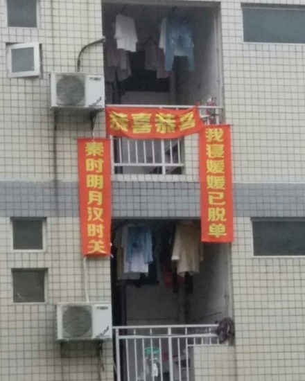 今年脱单挂横幅已经不新鲜了,2017年9月25日,重庆一高校上大学的小周,刚下完课在回寝室的路上,发现自己住的宿舍楼挂了一副脱单对联,还有横批!觉得有意思, 遂将其发到网上。此事没多久便引发了热议,有网友直呼这才是真爱,妥妥的中国好室友,又撒得一把狗粮。