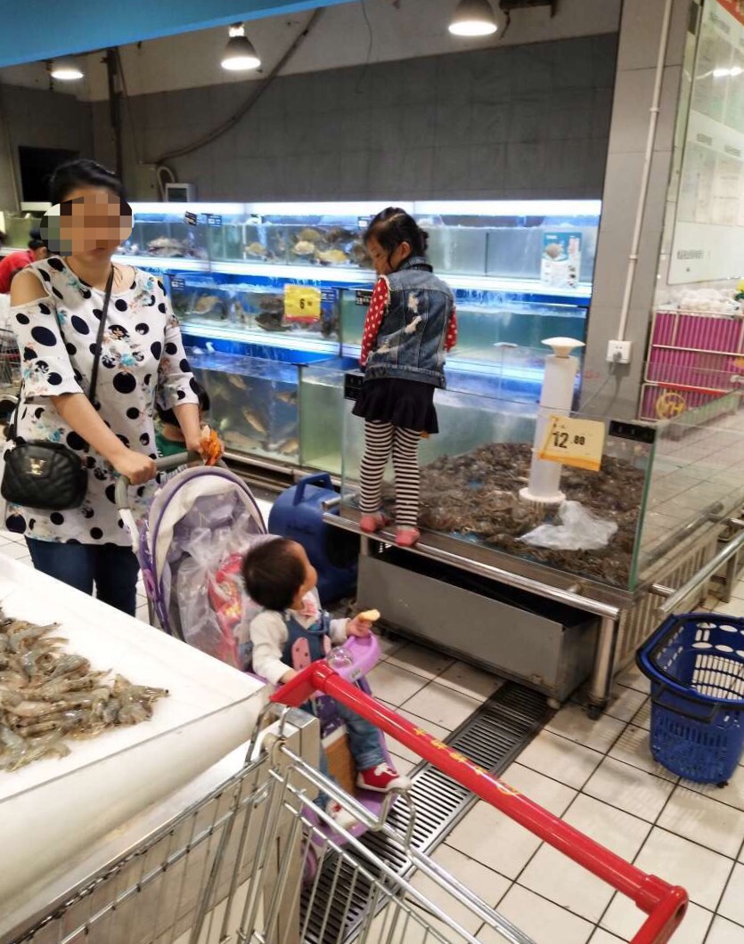 2017年9月27日晚上,向先生如往常一样去永辉超市时代商都店购买第二天的食材。路过生鲜区时,见到一个穿着牛仔马甲的小女孩正攀爬在鱼缸上。