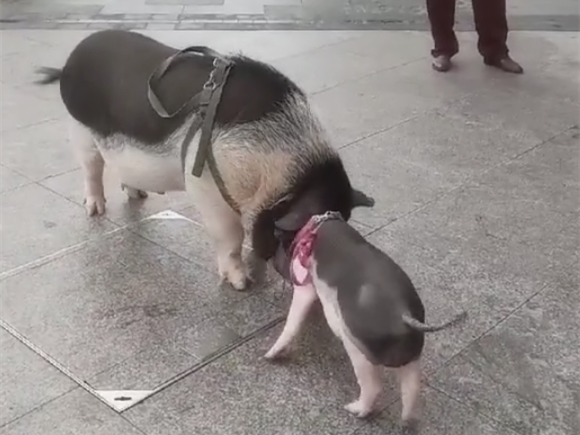 小香猪走着走着饿了,还时不时的跑到大香猪身旁吸奶,两头香猪的动作十分呆萌,引来不少路人的好奇围观,惊呼“八戒”太可爱。