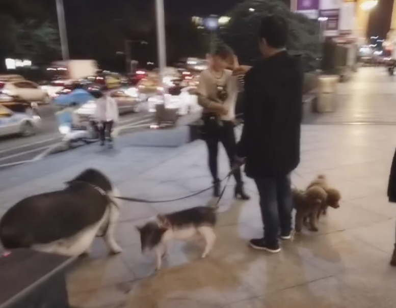重庆一夫妇街头遛2只猪和2只狗 画面逗趣引围观