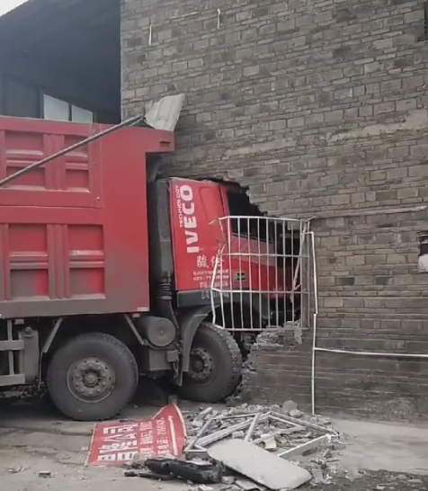大货车的半个车头已经陷进墙里,大伙见状赶紧报了警。