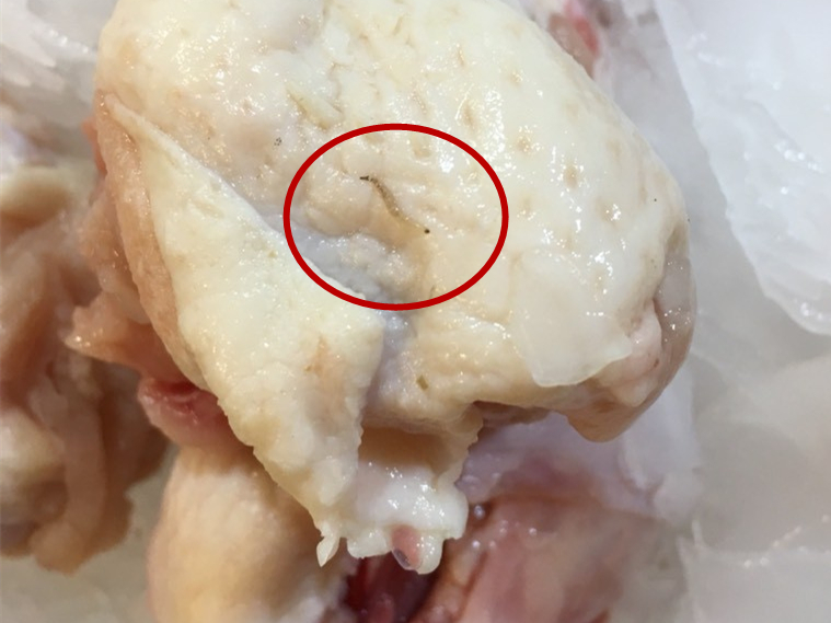 小钱将其中一只看起来不错的鸡腿翻过来,仔细的看了看,没想到竟看到鸡腿上长蛆了。一只如米粒般大小的蛆还蠕动着,让小钱看后直打冷颤。