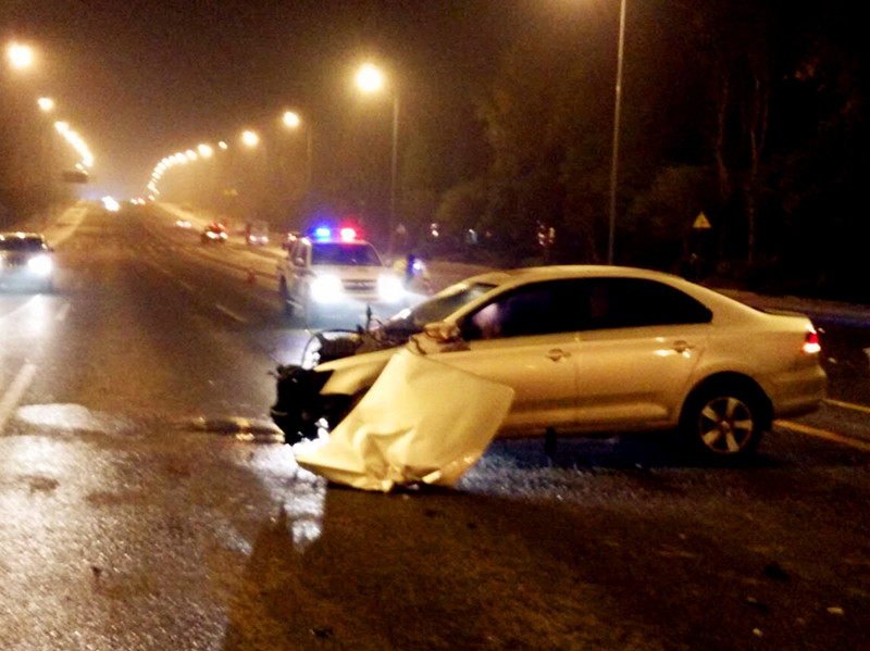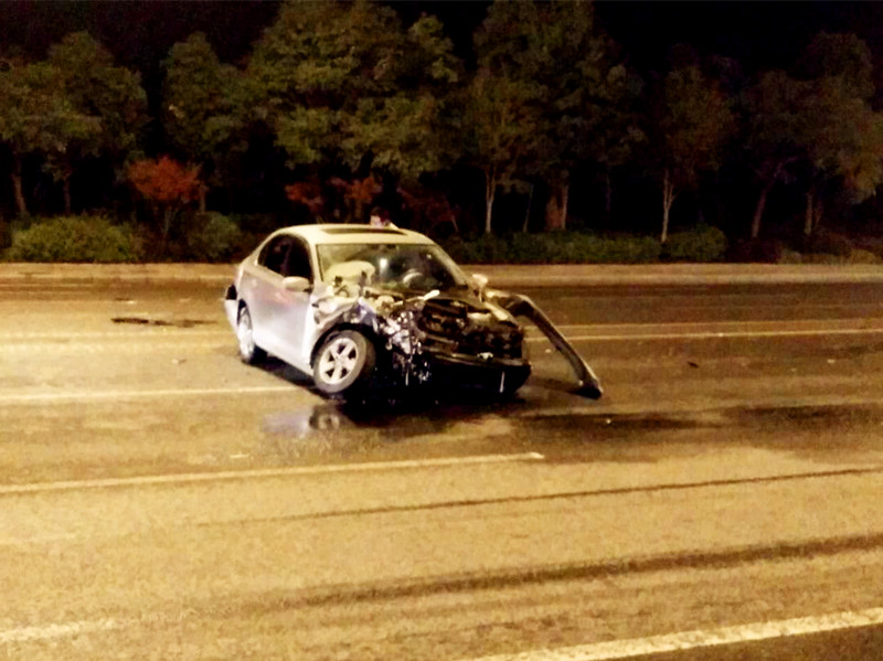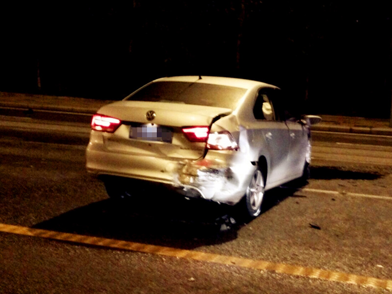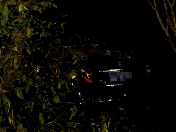 在事发现场一侧的道路外,还有一辆私家车已经冲出了车道,扎入了道路外的树丛中,因天色太暗,看不太清楚受损情况。