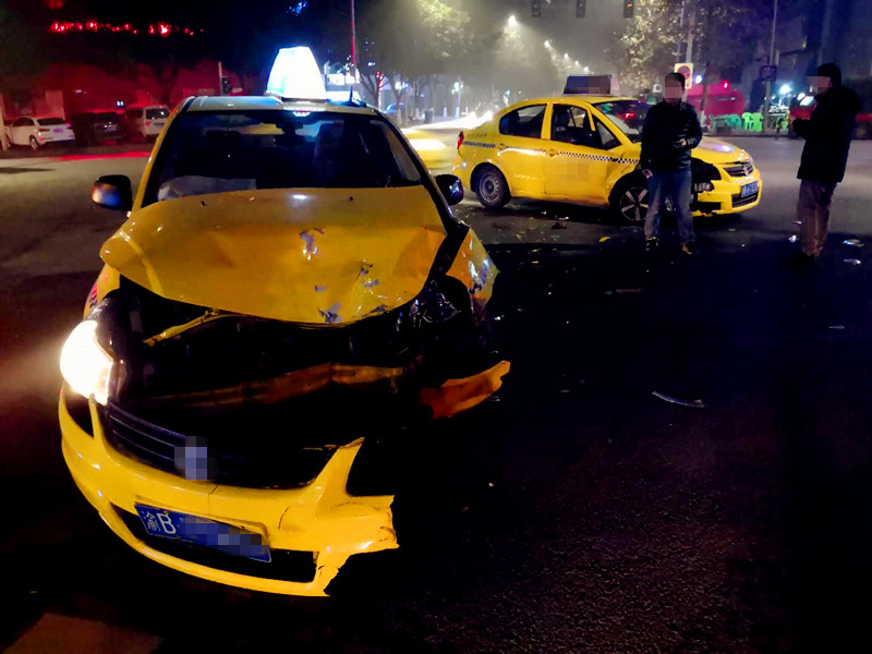其中一辆出租车右侧保险杠被撞毁,车头引擎盖内的零配件发动机已经暴露了出来,车体右侧已经凹陷,右侧大灯已经被没有了踪影。