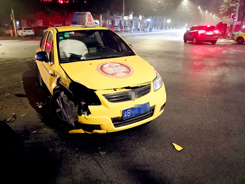 另外一辆出租车损毁比较严重,整个车头已经完全变形,引擎盖被撞到掀起,保险框已经被撞断并拖地。引擎盖内的发动机及周边零配件也有被撞坏的痕迹,地上散落着不少的车身残骸。