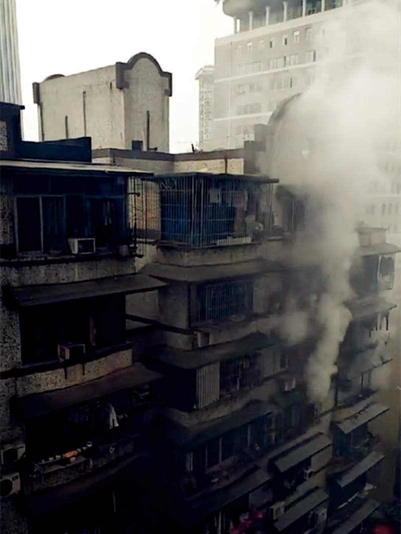 失火住户窗外,伴着跳动的火焰,还有一些物件冒着白烟滚落下来。