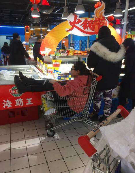 女子蜷坐购物车内逛超市 背后还有人推着跑