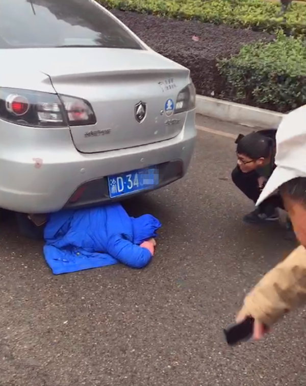 现场,我们可以看到,一名穿着蓝色连帽上衣的行人,躺在车底下,帽子将头部完全遮住,看不清行人的面貌。