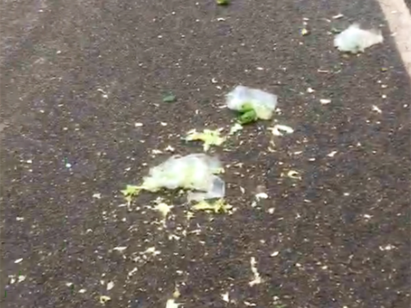事故现场,散落着大量被碾压成碎渣的蔬菜,还有一些白色的塑料袋子,看着一片狼藉。