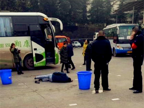 2018年1月31日下午,重庆江津客运中心车辆停放区域内,一男子躺在地上。