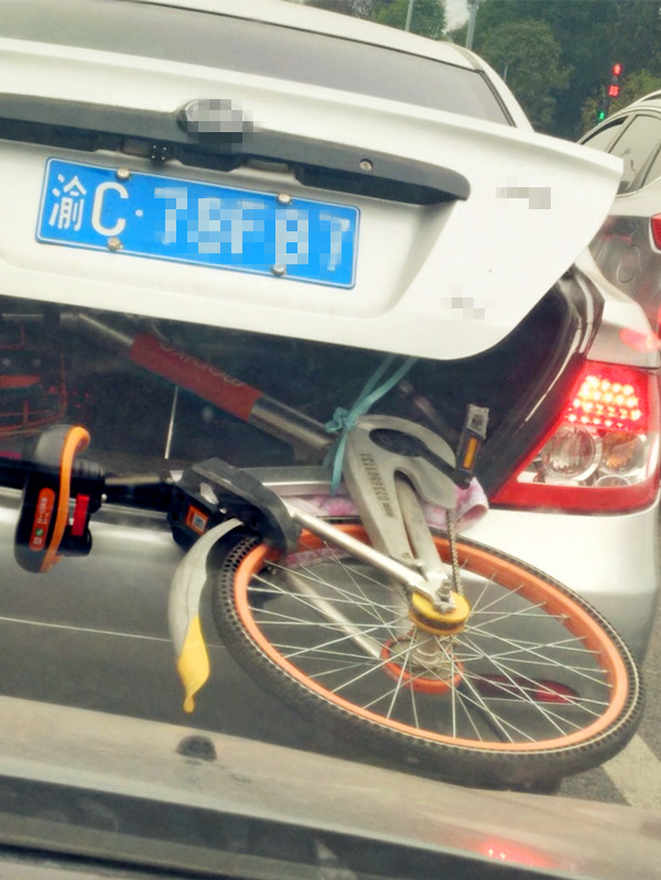 轿车后备箱塞进半个共享单车 目击者:摇摇欲坠很危险
