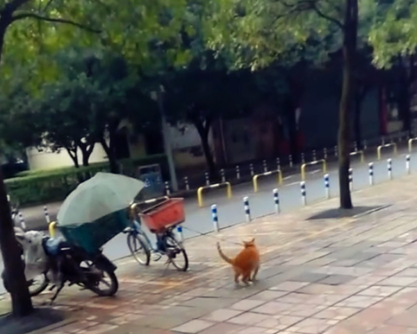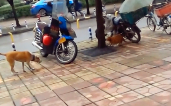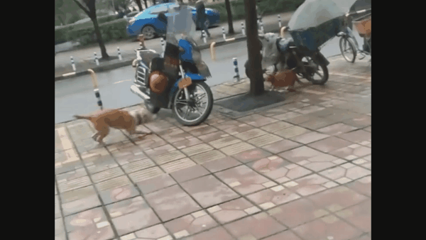 小橘猫被套在一辆摩托车后面,并不怎么长的绳子周围,便是它活动的地方。正在橘猫温顺休息的时刻,一只小黄狗突然跑过来,对橘猫展开骚扰。
