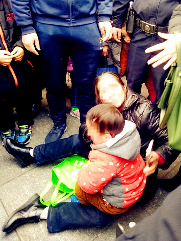 大妈一直带着孙娃,坐在地上情绪一直不能平静,引得市民陆续前往围观。