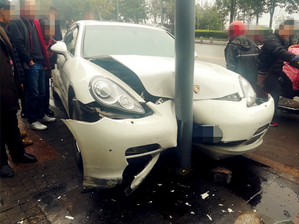 保时捷撞上路边电杆 车头凹陷严重变形
