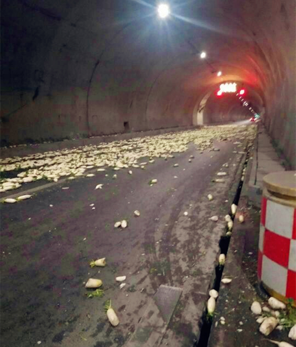 通过现场图片,我们可以看到,整个隧道的地上都散落着白嫩滚圆的大萝卜,好多都被车辆碾压,碎成一段一段的,看着非常可惜。