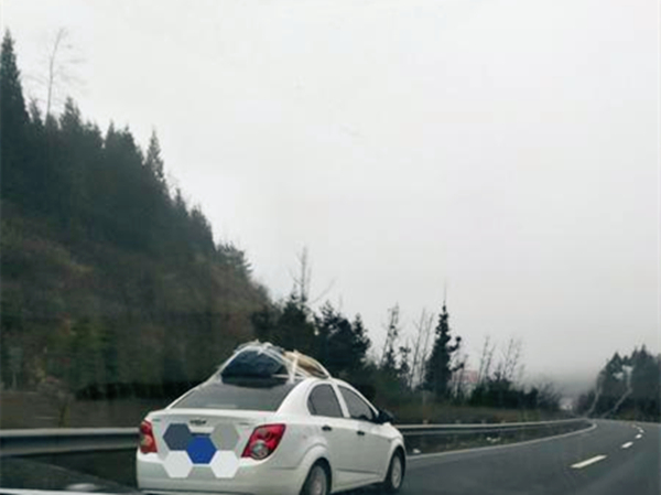 从网友提供的的照片我们可以看到,这辆白色的小轿车车顶所载的行李,约有半米高,而这些行李就用几根透明胶带横七竖八的缠着,摇摇欲坠。