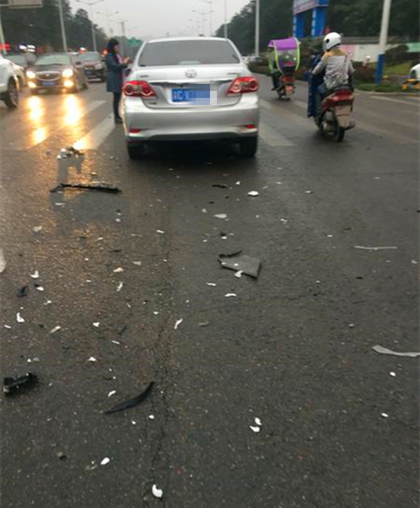 在两辆轿车相撞的现场,地面上散落着许多车辆碎片,两辆车都有不同程度损毁。