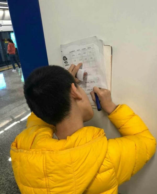 报料市民说,这男孩推测七八岁的模样,应该是一名小学生,上身穿着一件黄色的棉袄,背着一个双肩蓝色书包。男孩将作业本放贴在墙面上,光滑的墙壁被他当成了临时书桌。男孩拿着笔在上面奋笔疾书,头时不时探头看列车来了没有。
