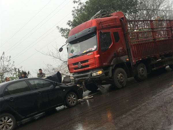 黑色轿车马路上逆行 猛撞大货车很受伤