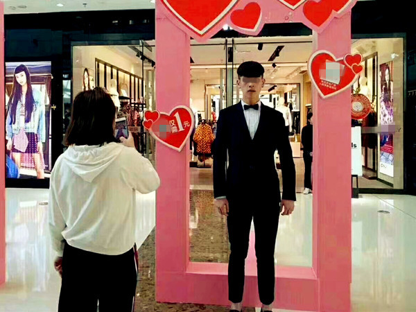 有不少男生女生前来扫码,想体验下1元共享男友,到底可以干点啥。在现场平均身高一米八以上的男子,统一穿戴着黑白西服,笔直站立面带微笑。站立在一个粉色框面前,框上标注着二维码及“仅需1元”“共享男友”等字样。