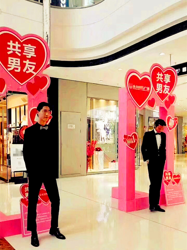 重庆永川有网友报料说:一商业广场里,日前也出现了“共享男友”,男子附近宣传物上标注显示“1元扫码付费,即可领走你喜欢的那款男友”。