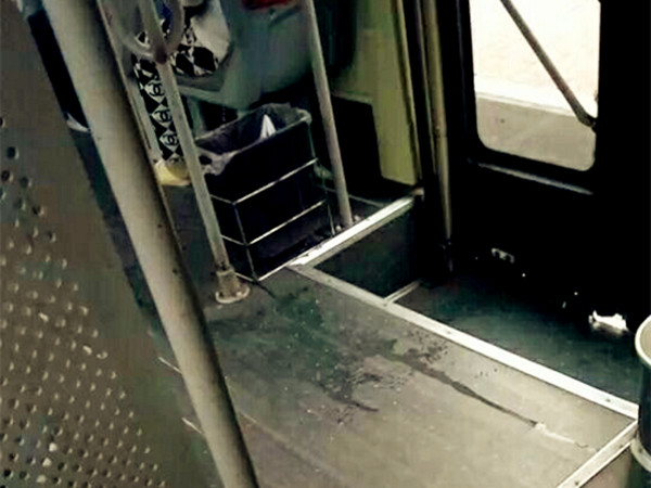 只见尿液从垃圾箱里漏了出来,四处流淌。整个车内的空气中,都弥漫着尿液的味道。尿液所处地位置,是这路公共汽车的下车口,是乘客们必经之处,也让乘客无从下脚。