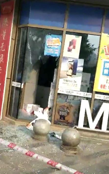 (店铺外玻璃碎渣散落一地)