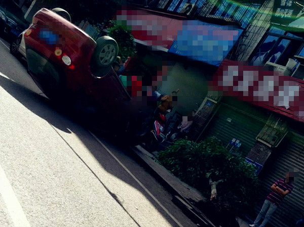 从爆料网友提供的图片来看:这辆红色私家车,四脚朝天,翻倒在路上,车身处有明显的划痕,车头受损,正好处在路边的梯坎上,前挡风玻璃也碎了。