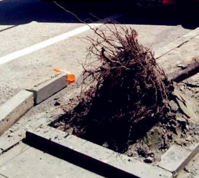 旁边还有一棵树,歪歪斜斜的倒在路边,这棵树已被连根拔起,并能看得见根须上伴随许多的泥土。