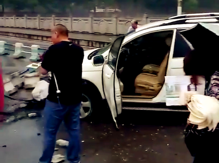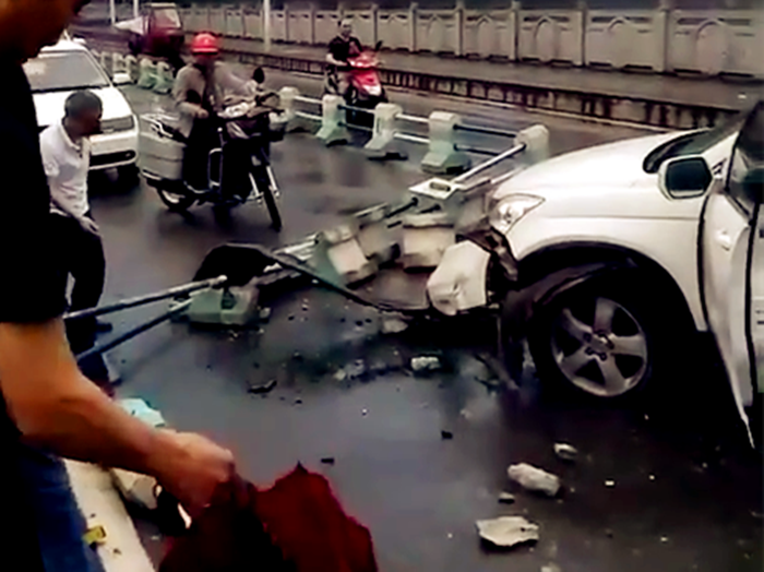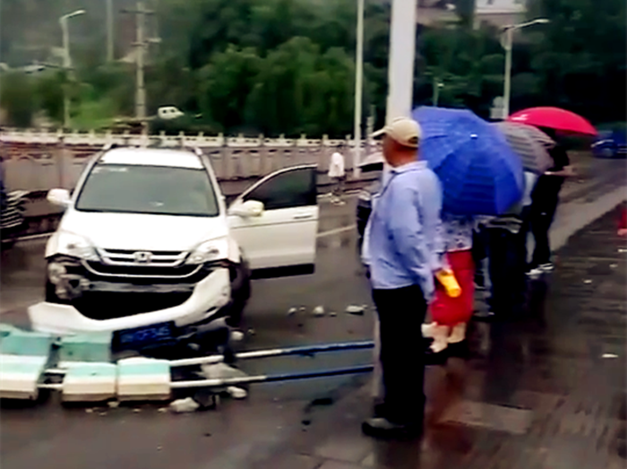 白色事故车辆在现场已经停了下来,车头保险杠脱落,车身残片散落在地面上,隔离护栏被撞变形。