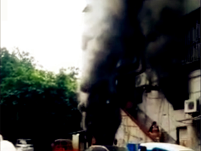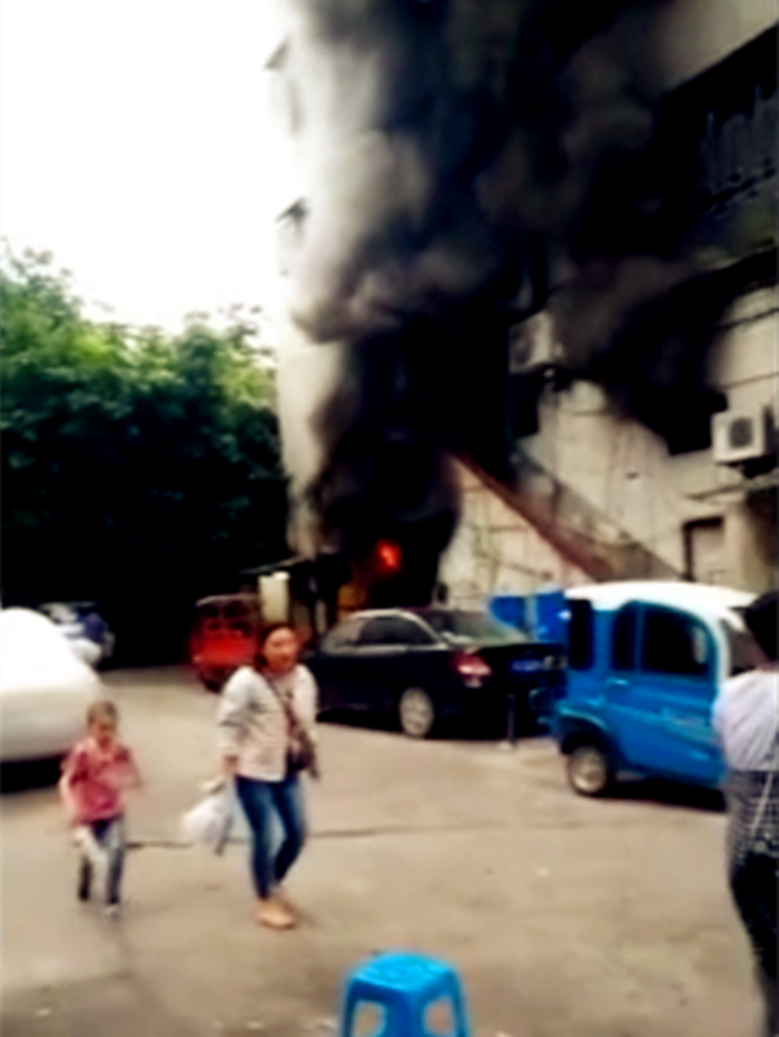 烤鱼店后门处也有路人经过,看到火情后,连忙向火场楼上住户大喊,提醒楼内居民赶紧撤离。听到喊声后,楼内有居民冲出不断外冒的黑色浓烟,赶紧逃离现场。现场浓烟往上升腾,多家住户阳台窗户已经被黑烟蒙蔽。