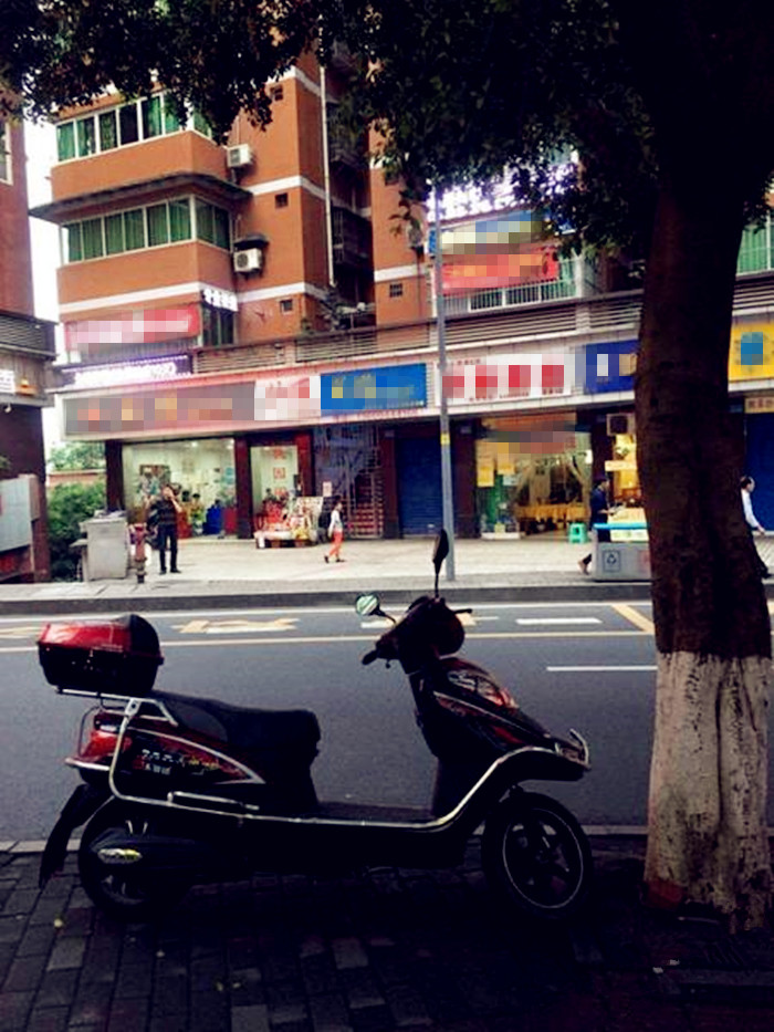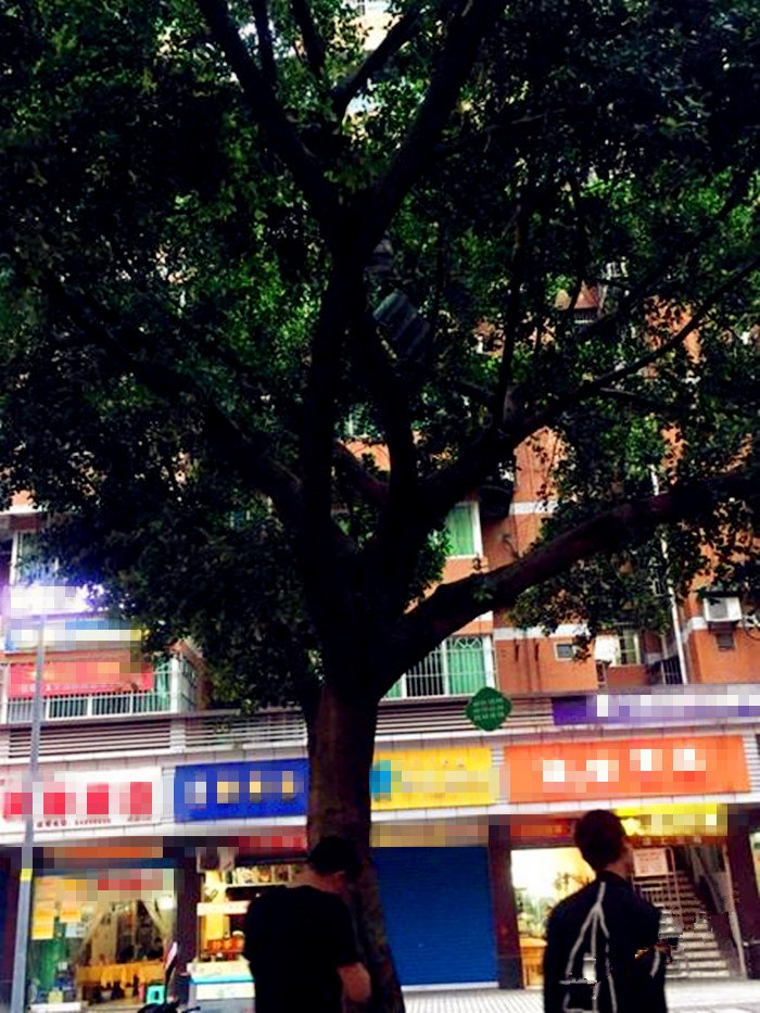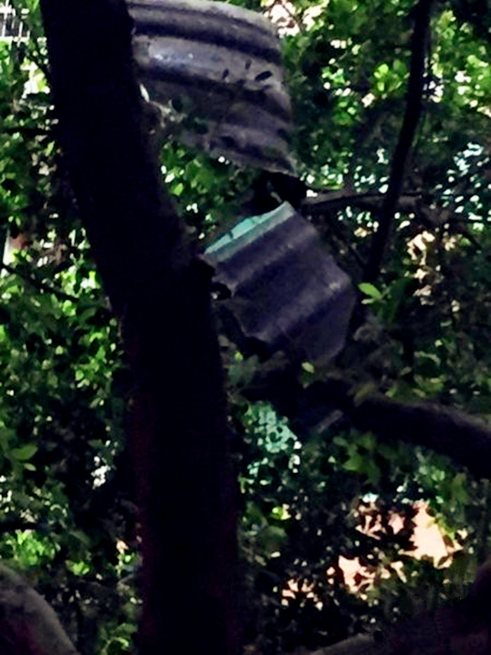 这两块铁皮波浪形状,大小不一,隐蔽在树枝与树叶间,不仔细看还真看不太出,仔细一看呈深灰色常见的瓦片有几分相似。铁皮恰好挂在树枝的缝隙,看上去很稳固,但很担心会一阵风把它们吹下来,离地面的距离大概有5米左右,砸到行人也不是不可能的。