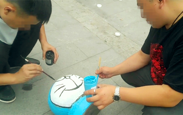 李小姐走进一看,原来是有两名男子在认真作画,有着新的创意。将隔离墩绘画成“哆啦A梦”的样子,两人配合十分默契,一人用墨汁勾画哆啦A梦的轮廓,另一人用颜料粉刷哆啦A梦的颜色。