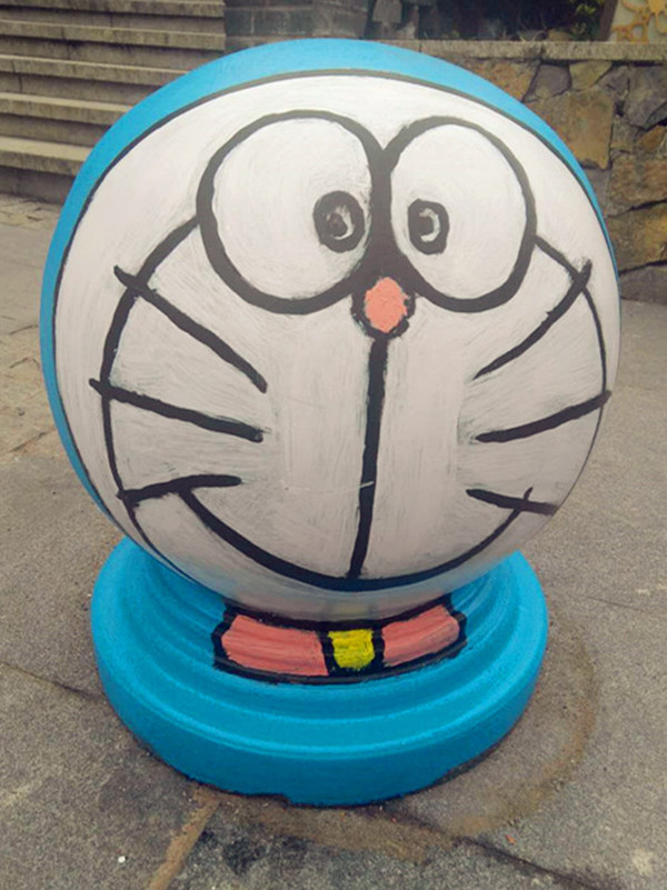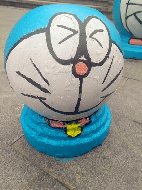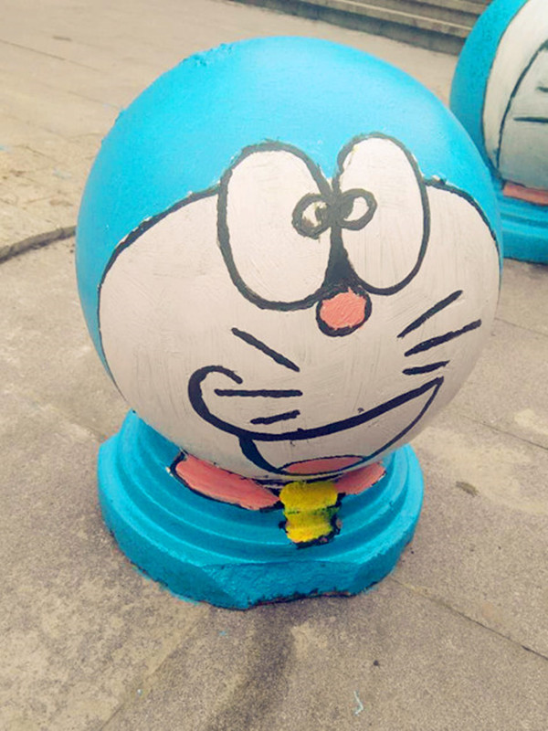两位男子一共制作了五个隔离墩,大小不一,全是哆啦A梦的表情包。表情各异的隔离墩并排成一排,成为这条道路的另一番风景。可想而知,两位男子是哆啦A梦的忠实粉丝呀。