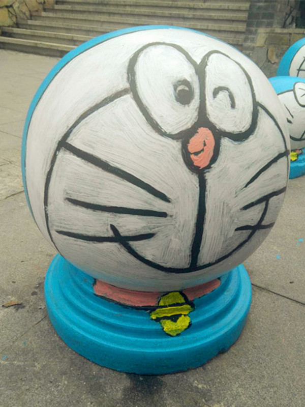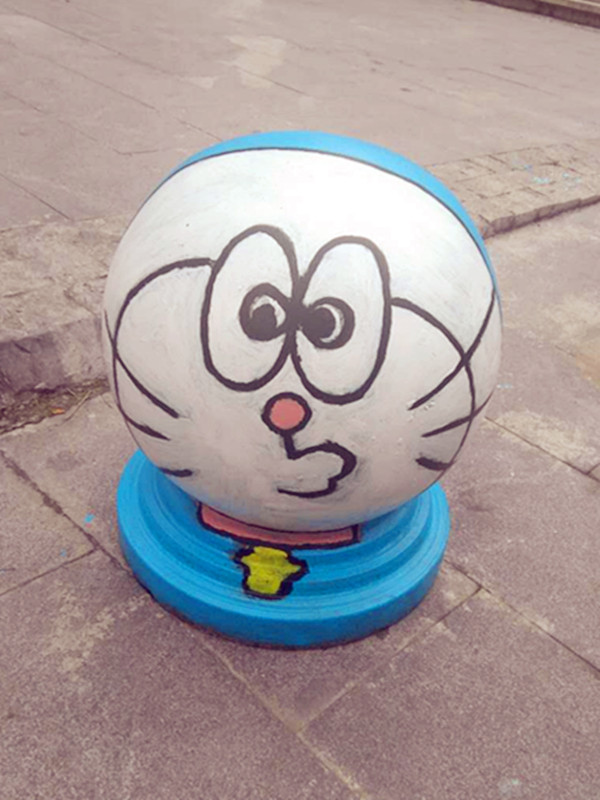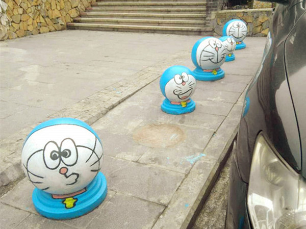 重庆街头现呆萌“哆啦A梦”隔离墩 引路人驻足围观