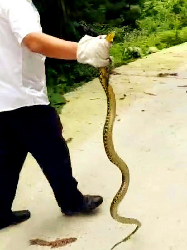 只见一位白衣男子,戴上白色手套,身手敏捷迅速捉住蛇,并锁住喉咙,只见蛇的嘴巴使劲张开,似乎是向同胞呼救。