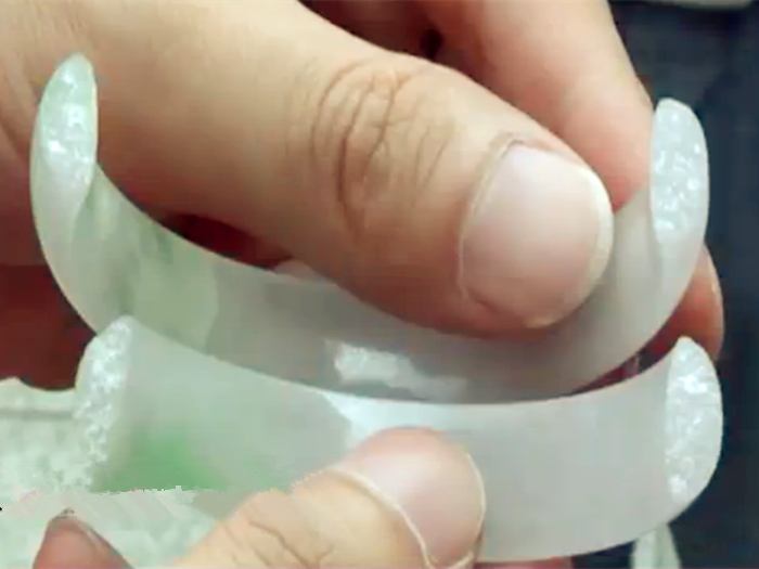 断裂后的玉镯可见两条明显的裂痕,玉镯已经一分为二,裂口可见凹凸不平的玉痕。